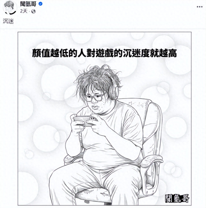最近有图文作家在外交平台发布了一张漫画,并配文示意:“颜值越低的东说念主,对游戏的千里迷过程越高。”