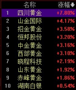 早盘,贵金属板块发扬活跃。四川黄金早盘一度迫临涨停,法例发稿涨7.8%,山金国外涨超4%,招金黄金、中金黄金、西部黄金、恒邦股份涨超3%。